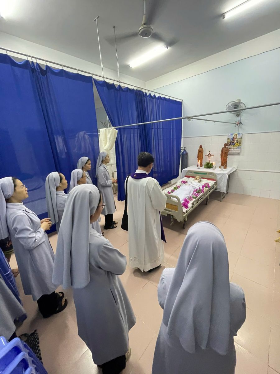 Chị em chúng tôi, đón bà từ bệnh viện 115 về với Nhà Mẹ của Hội Dòng để lo hậu sự. Trên giường bệnh, những giờ sau hết, bà được sự quan tâm - thăm hỏi động viên của bà con hàng xóm khu trọ. Sự tận tình cứu chữa của các y bác sĩ Bệnh viện 115, đặc biệt quý Cha chánh xứ và phó xứ Giáo xứ Tân Đông cùng với trùm khu và bà con giáo dân quan tâm đồng hành. Bà vui mừng được lãnh đầy đủ các Bí tích sau cùng để thảnh thơi an bình trút hơi thở cuối cùng trong tiếng nguyện lời kinh của chị em chúng tôi.